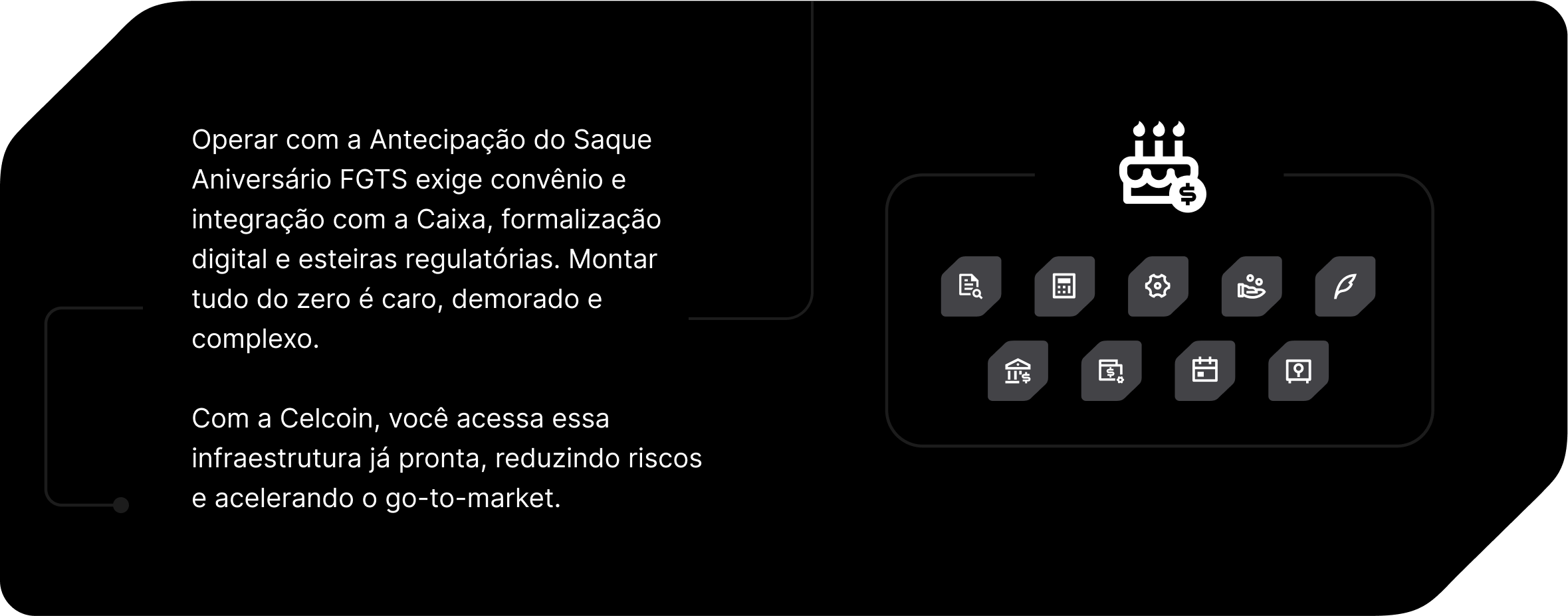 Com a infraestrutura da Celcoin, sua empresa monta a operação de antecipação do saque-aniversário do FGTS em semanas. Da integração com a Caixa à formalização digital e liquidação automatizada.