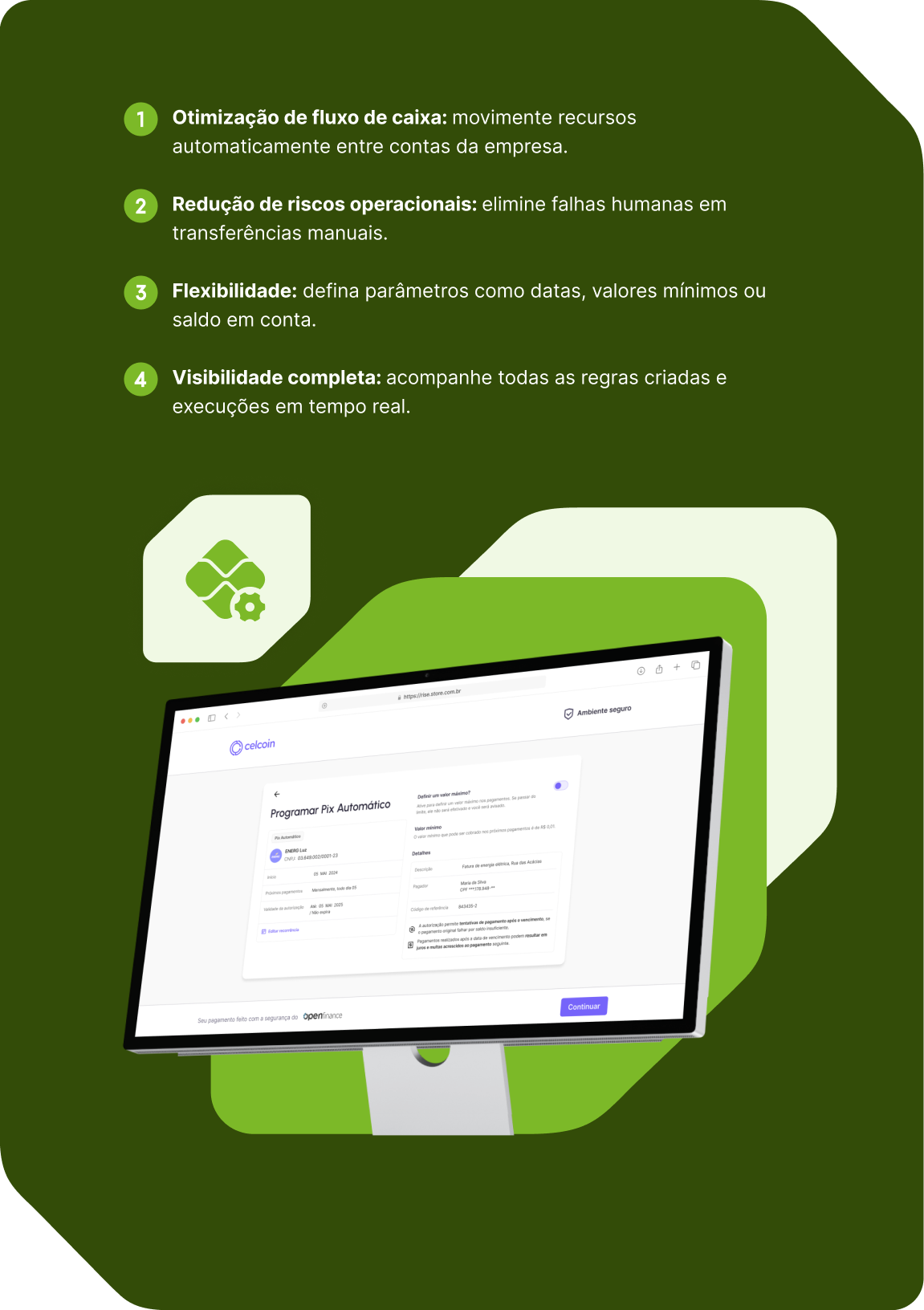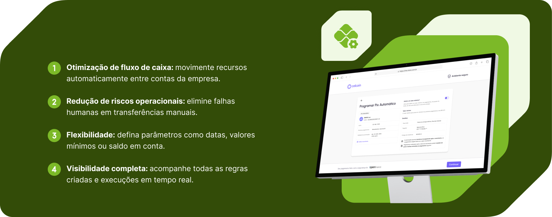 O Pix Inteligente oferece a infraestrutura regulada e segura para empresas que desejam simplificar movimentações internas entre contas, conectando-se de forma nativa ao ecossistema Open Finance da Celcoin.
